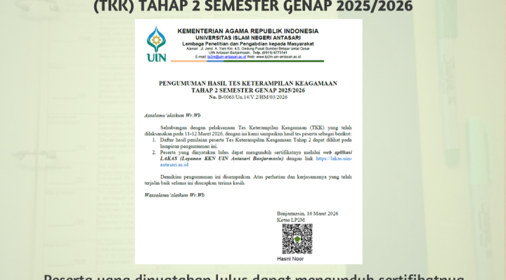 Silahkan unduh PENGUMUMAN HASIL TES KETERAMPILAN KEAGAMAAN (TKK) Tahap 2 Semester Genap TA 2025/2026 PENGUMUMAN HASIL TES KETERAMPILAN KEAGAMAAN (TKK) Tahap 2 Semester Genap TA 2025/2026.