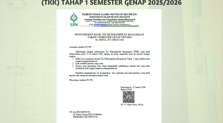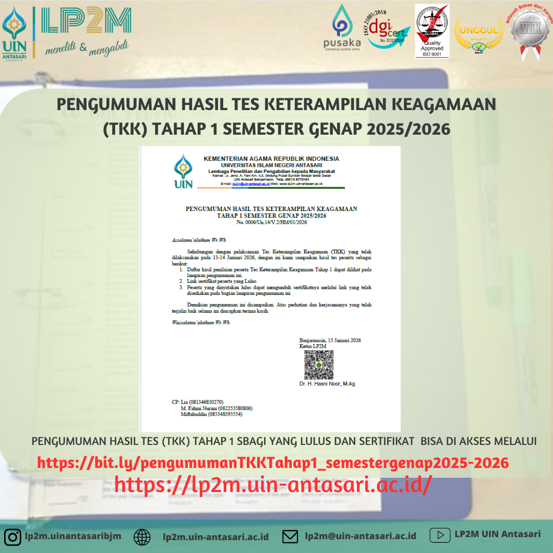 Silahkan unduh PENGUMUMAN HASIL TES KETERAMPILAN KEAGAMAAN (TKK) Tahap 1 Semester Genap TA 2025/2026 PENGUMUMAN HASIL TES KETERAMPILAN KEAGAMAAN (TKK) Tahap 1 Semester Genap TA 2025/2026.