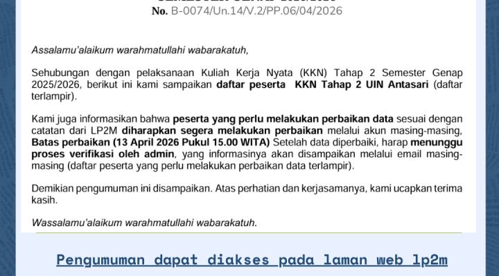 Silahkan unduh PENGUMUMAN PESERTA KKN TAHAP 2 SEMESTER GENAP 2025/2026 PENGUMUMAN PESERTA KKN TAHAP 2 SEMESTER GENAP 2025/2026.